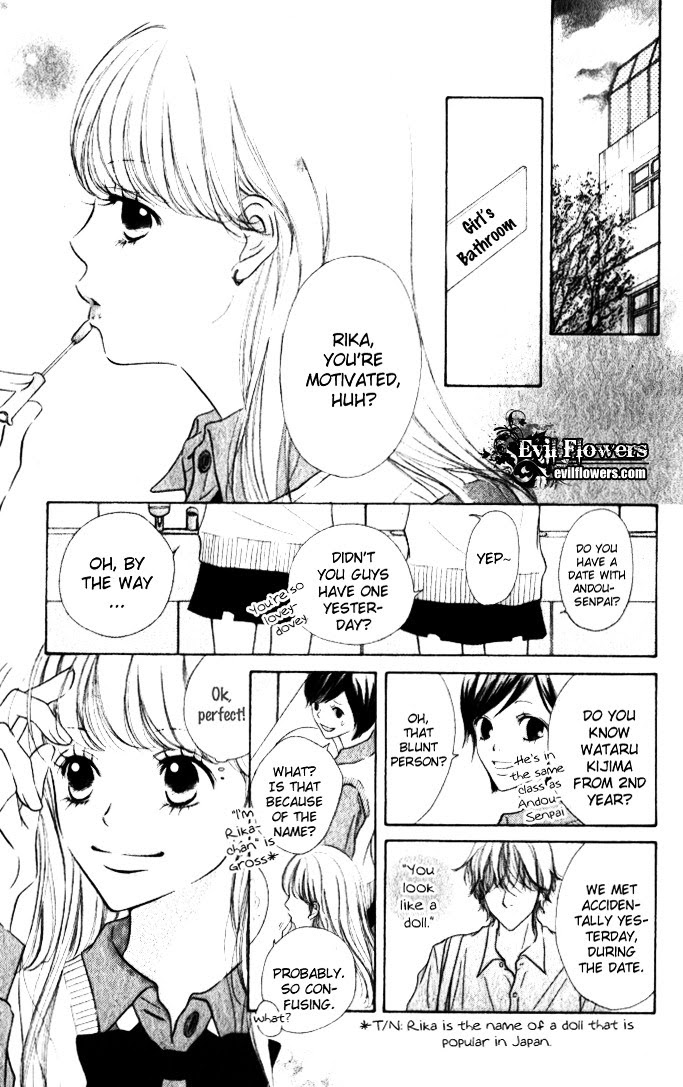 Rika can be considered lucky: she was able to get the boy of her dreams, Ando-senpai, but things aren't going so well between the two. Ando is always skipping their dates and what's with this quote she's always hearing from Andou's classmate, Kijima-senpai: "You're just like a doll." Is it because of her name, or because she always acts the way Andou tells her to? Why would he even care? (Source: Evil Flowers)