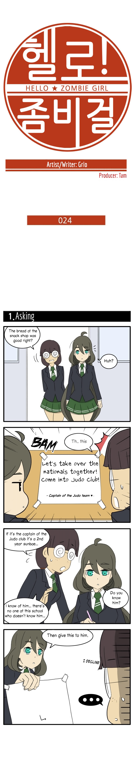 Hello Zombie Girl manga summary: Daily life of Maru Jeong and his friend, who take care of a zombie-looking robot girl sent by Maru's grandfather for 300m Won.
