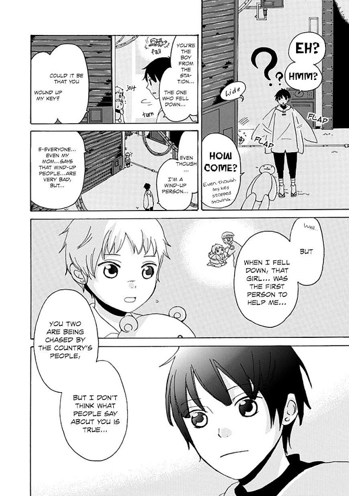 Certain people suffer from a mysterious disease which causes a wind-up key to appear somewhere on their body. The key has to be wound regularly, otherwise they will stop moving. Miku's parents, who suffer from this disease, are captured by the authorities, while Miku escapes into the town to seek help from a mysterious boy called Kuro. (Source: MU)