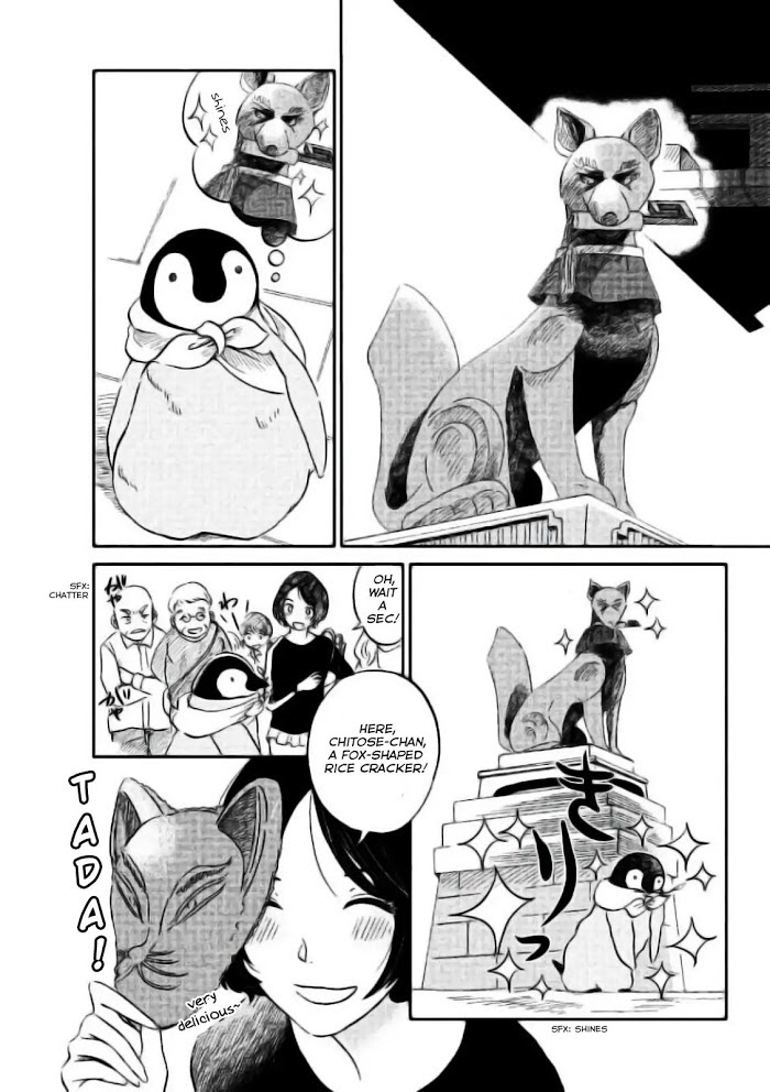Welcome, Chitose-chan manga summary: There's a penguin living in Kyoto named Chitose-chan. This fluffy and adorable penguin loves to eat and have fun. She's friendly with humans and allows them to feed her. She travels around Kyoto, letting her curiosity be her guide. This manga features famous parts of Kyoto such as Kiyomizudera, Ginkakuji, and Gion as seen from the eyes of a penguin.