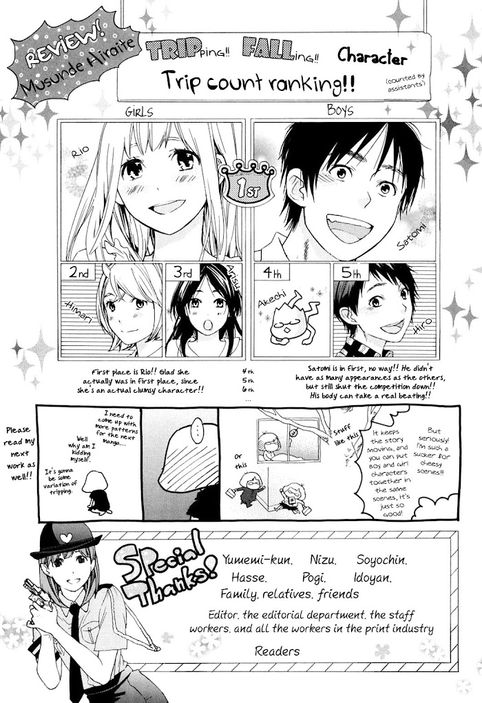 Musunde Hiraite (MINASE Mayu) manga summary: For Chapter 1: On the first day of school, Furuya Hiro sleeps in causing him to miss the opening ceremony. Because of this, he gets to meet Himari Asaki, the top girl in school. He falls in love with her instantaneously; so, he decides to confess his feelings for her.... repeatedly. Unfortunately for him, she rejects him every time without fail. On one of these occasions, he accidentally drops his cell phone (which of course has a candid photo of Himari for his wallpaper). Himari finds it and returns it to Furuya at his house. There we find out that Furuya's sister is actually a friend of Himari along with the fact that Himari is androphobic. Each chapter focuses on a different character, although they are all related through being classmates.